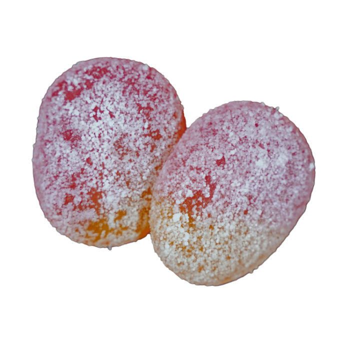 Ingredienser: Sötningsmedel (maltitolsirap), gelatin, vatten, isomalt, surhetsreglerande medel (citronsyra), arom, färg (E120, E161b). Innehåller Sötningsmedel. överdriven konsumtion kan ha laxerande verkan